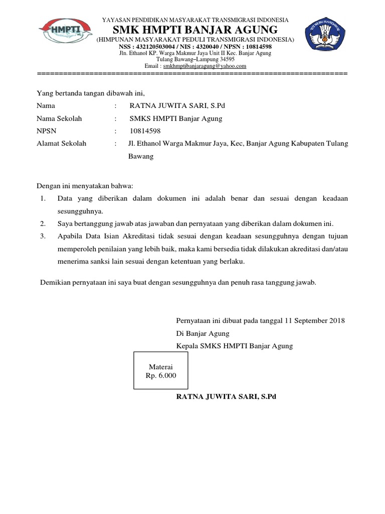 Surat Pernyataan Kebenaran Kepala Sekolah. Segala tindakan yang diambil oleh perusahaan atau instansi apabila di kemudian hari ditemukan ketidak benaran. Biasanya surat ini dilengkapi dengan materai sebagai penguat kepercayaan dan agar terlihat kredibel. Surat pernyataan sekolah biasanya dibuat oleh pihak administrasi atau tu dengan tanda tangan kepala sekolah. Banyak orang yang masih asing dengan klausa yang satu ini. Dalam hal ini perlu diketahui bahwa surat keterangan adalah.